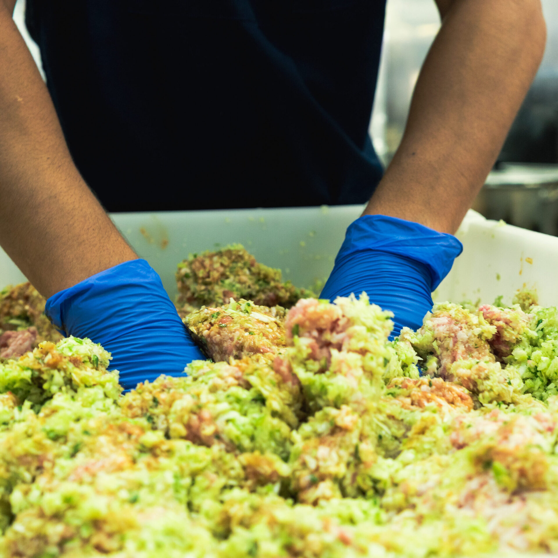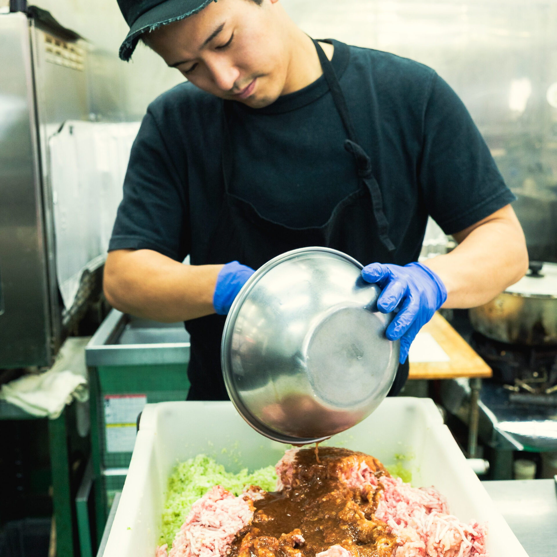 外側は食べ応えのある豚モモ。中はたっぷり野菜、豚肉と鶏肉の絶妙な餡の黄金比。にんにくパワーで疲れた身体を元気にしてくれます!