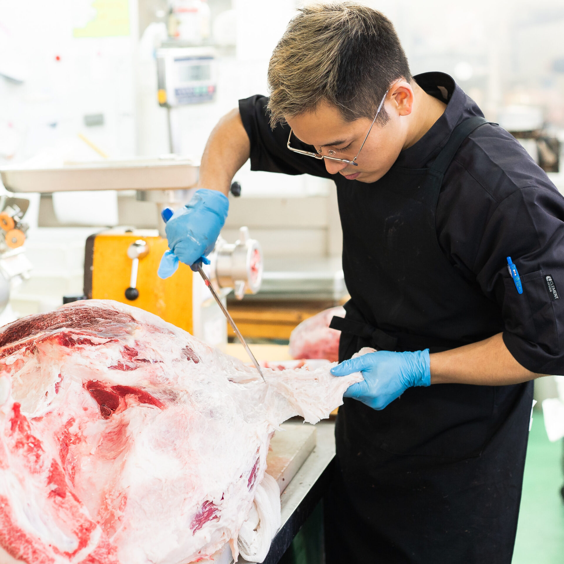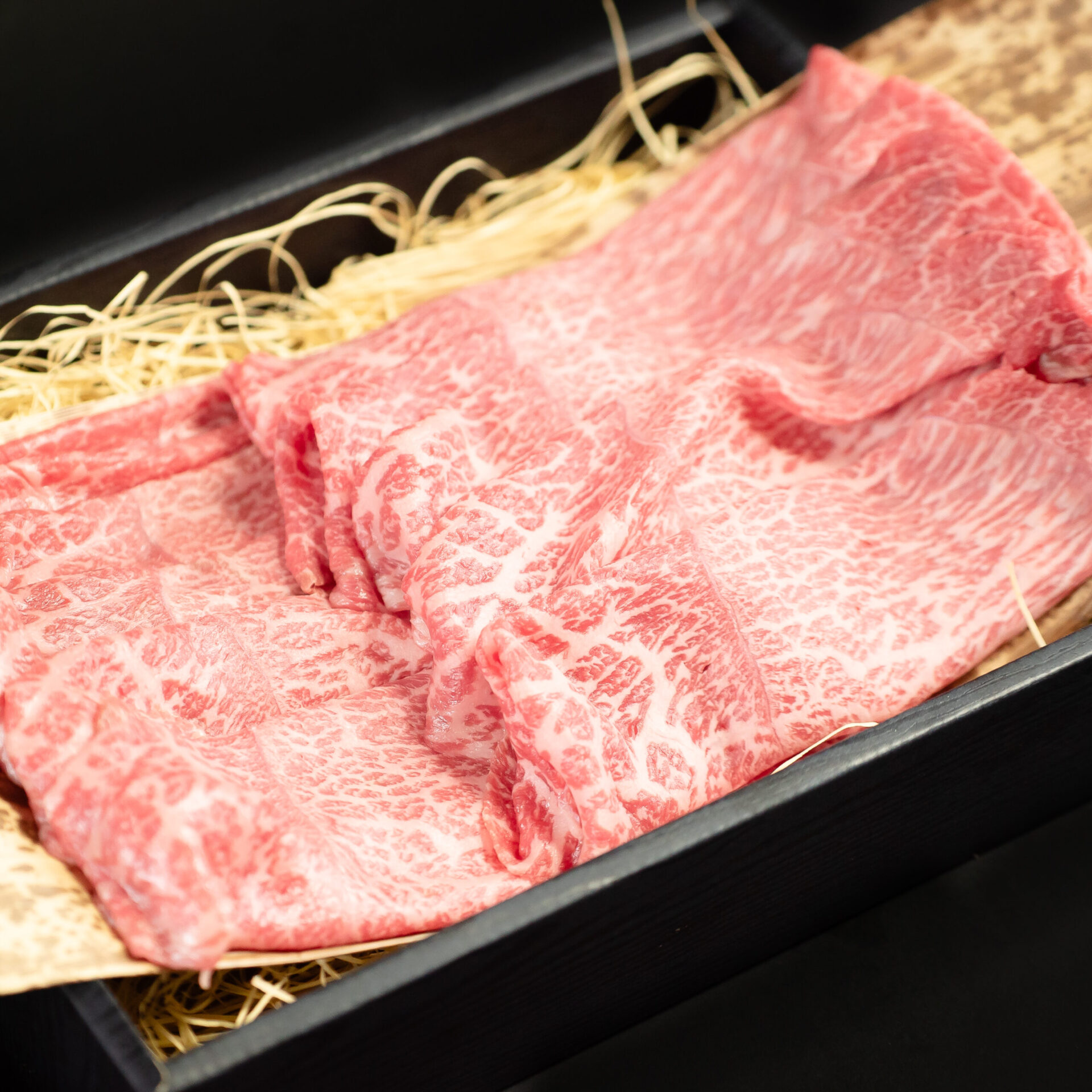 『ウデ(肩)』の部位はきめ細かい赤身で旨みがしっかり、適度な歯ごたえがありながら薄くスライスするとやわらかくなります。脂が少なめで甘い割下との相性が抜群です。コクのある赤身が好きな方にオススメな部位です。
